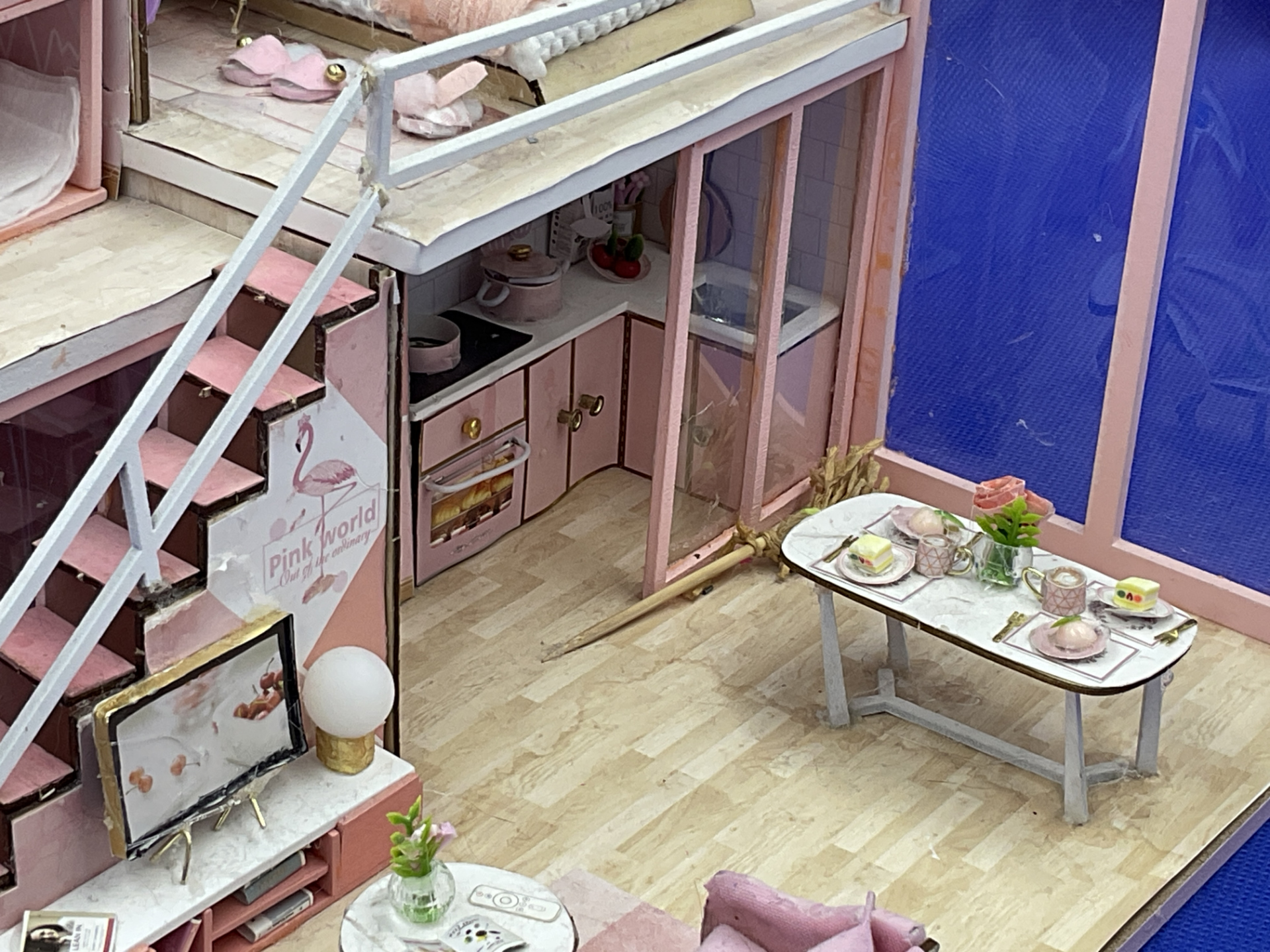 First Floor: Upon entering, the first floor opens up to a spacious and airy living room, designed for family gatherings and relaxation. The living area includes a comfortable miniature sofa, a coffee table, and a small entertainment center. Adjacent to the living room is a well-appointed kitchen, featuring miniature appliances, a family-sized dining table, and plenty of counter space for meal preparations. The kitchen is designed to be the heart of the home, where the family can come together to cook and enjoy meals.